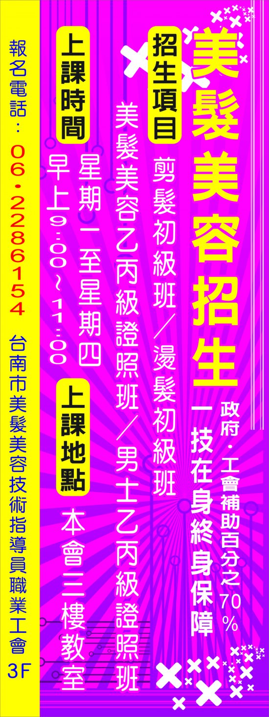 招生項目:剪髪初級班 / 燙髪初級班 / 美髪美容乙丙級證照班 / 男士乙丙級證照班